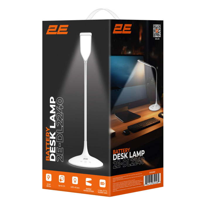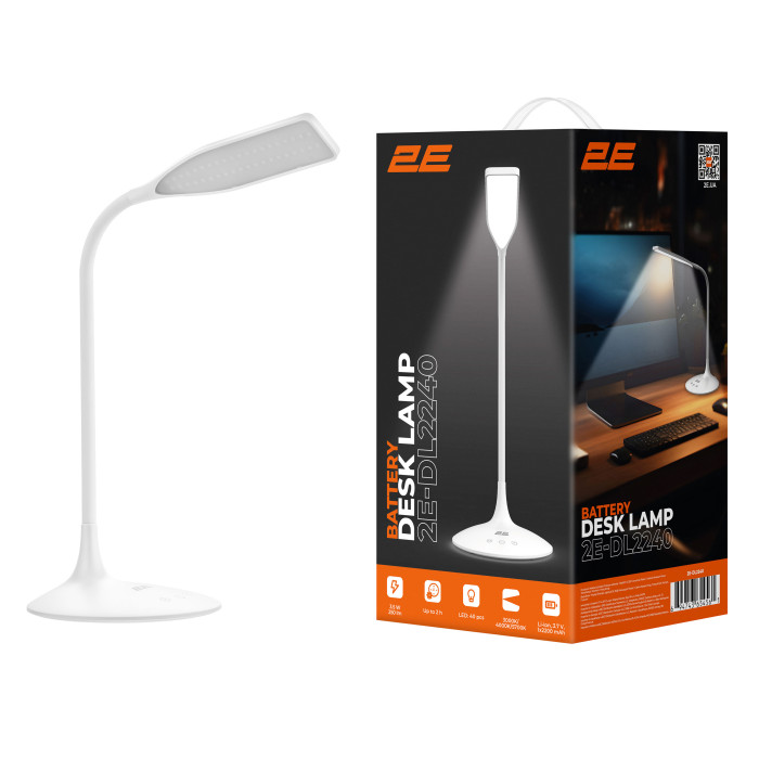 Настільна лампа 2E-DL2240 – стильний і практичний аксесуар для дому та офісу. Завдяки можливості регулювання колірної температури можна створити бажану атмосферу для роботи, читання чи відпочинку: передбачено три режими – тепле (3 000 K), нейтральне (4 000 K) і холодне (5 700 K) світло.