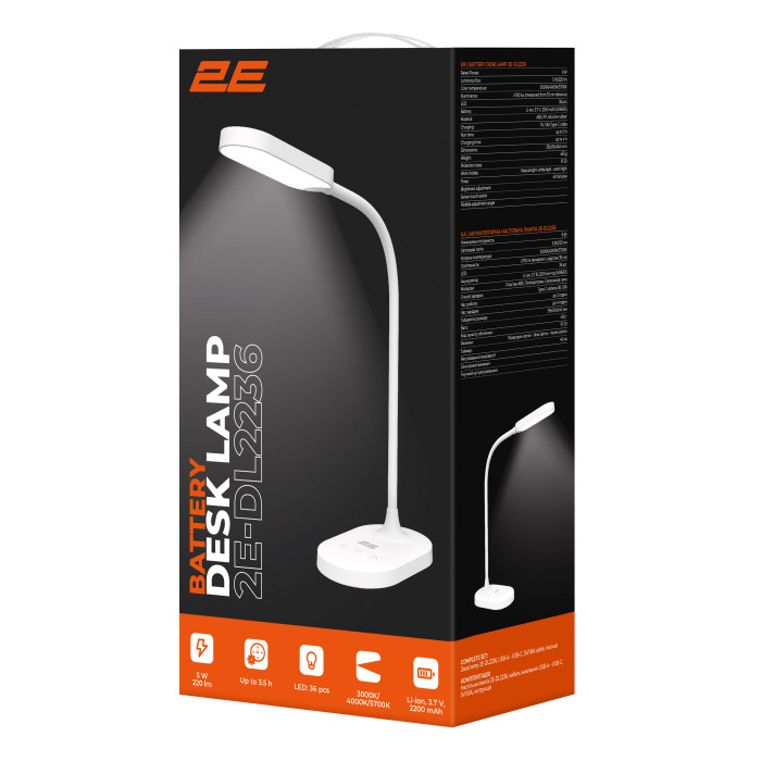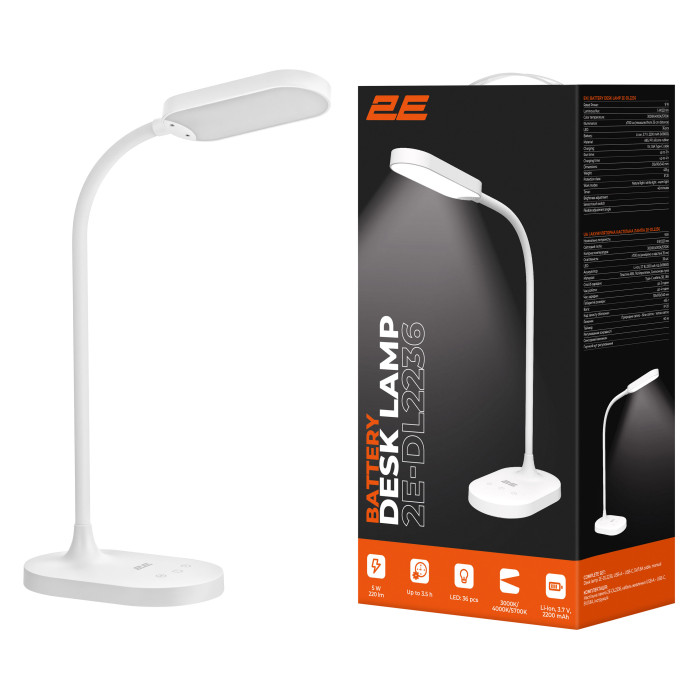Настільна лампа 2E-DL2236 – елегантне поєднання стилю і практичності. Потужність 9 Вт забезпечує яскраве та рівномірне освітлення і пропонує три режими колірної температури (теплий 3 000 K, нейтральний 4 000 K, холодний 5 700 K), які оптимально згодяться для роботи, читання чи відпочинку.