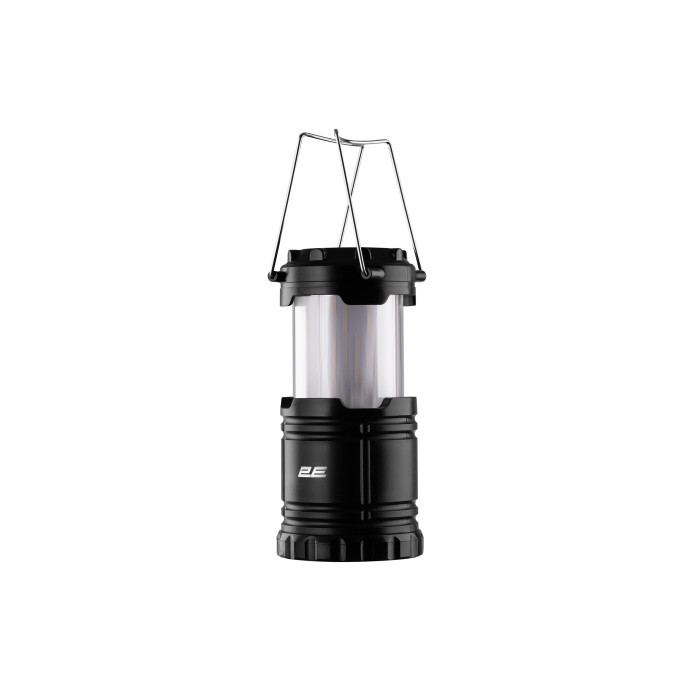 Кемпінговий ліхтар 2E-PLBL3AA зі світловим потоком 150 люмен має два типи світіння: «полум’я» та біле LED-освітлення потужністю 3 Вт. Дальність світла становить 10 м. Корпус чорного кольору виготовлено з пластику, клас захисту IPХ44. Ліхтар має висувну складану конструкцію, зум для регулювання діаметра світлового променю та п’ять режимів освітлення: потужне, середнє, низьке, стробоскоп та SOS. Працює від трьох батарейок АА, час роботи становить від 2 до 5 годин.