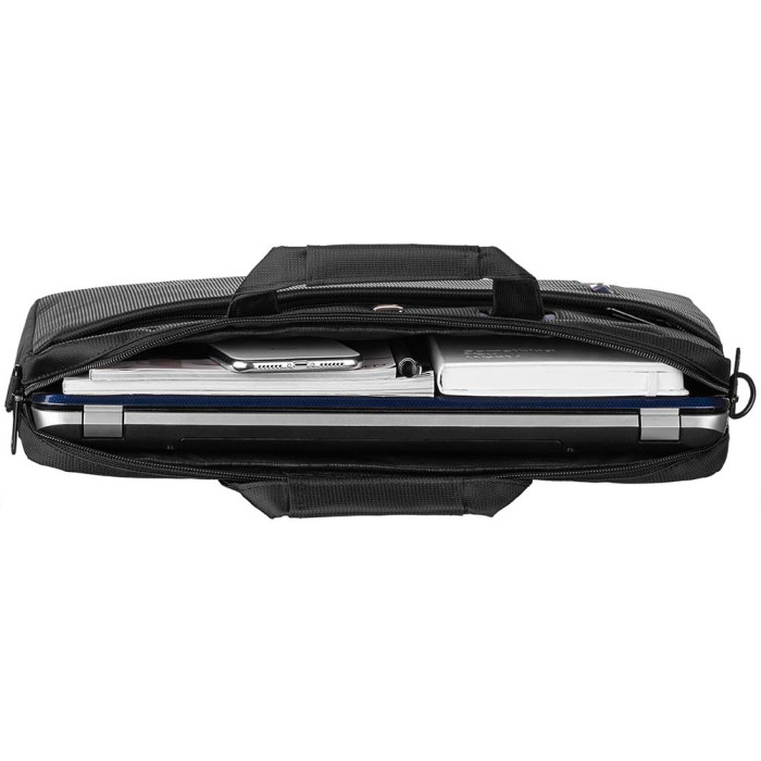 Сумка чорного кольору з синіми вставками для повсякденного використання. Виконана з водовідштовхуючого нейлону в комбінації з матеріалом дна і стінок, що амортизує поштовхи та удари.... Читати далі...