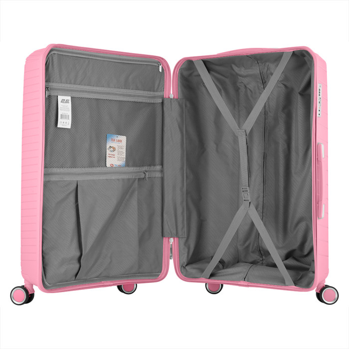 Валіза бренда 2Е серії SIGMA вражає поєднанням функціональності й сучасного стилю. Міцний і легкий корпус з поліпропілену, а верхня та бічна ручки з каучуковими вставками для додаткового комфорту під час транспортування. Внутрішній простір дає змогу розмістити все необхідне за своїми місцями. Зокрема є дві внутрішні кишені на блискавці та перехресні ремені для фіксації речей. Для безпеки вбудований кодовий замок TSA. Завдяки чотирьом тихим здвоєним колесам, що обертаються на 360°, алюмінієвій телескопічній ручці, що фіксується у кількох проміжних положеннях, користування валізою перетворюється на суцільне задоволення. Колір ручок, блискавок і коліс відповідає кольору корпусу валізи.