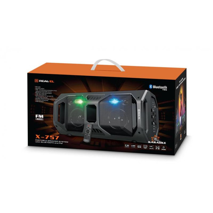 Мультимедійна Мультимедійна портативна акустична система REAL-EL X-757 має сучасний дизайн з RGB підсвічуванням і якісним звучанням. Широкий функціонал "бумбокса" дозволяє прослуховувати музику підключаючи мобільний пристрій, ПК, TV, ноутбуки і т. п., як через вивід AUX, так і по Bluetooth. USB і Micro SD card роз'єми дають можливість прослуховувати аудіо-файли з flash носіїв. X-757 відмінний супутник для відпочинку на природі, літій-іонний акумулятор на 4000 mAh забезпечить вас музикою на вельми тривалий час.
