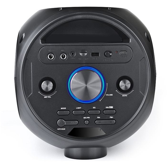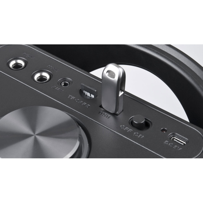 Real-EL X-787 — чудовий супутник для відпочинку на відкритій місцевості, два потужних літій-іонних акумулятори на 4400Ah забезпечать вас музикою на вельми тривалий час. Функція KARAOKE приємно здивує шанувальників співу, адже ця модель має можливість приєднання відразу двох мікрофонів із регулюванням відлуння.