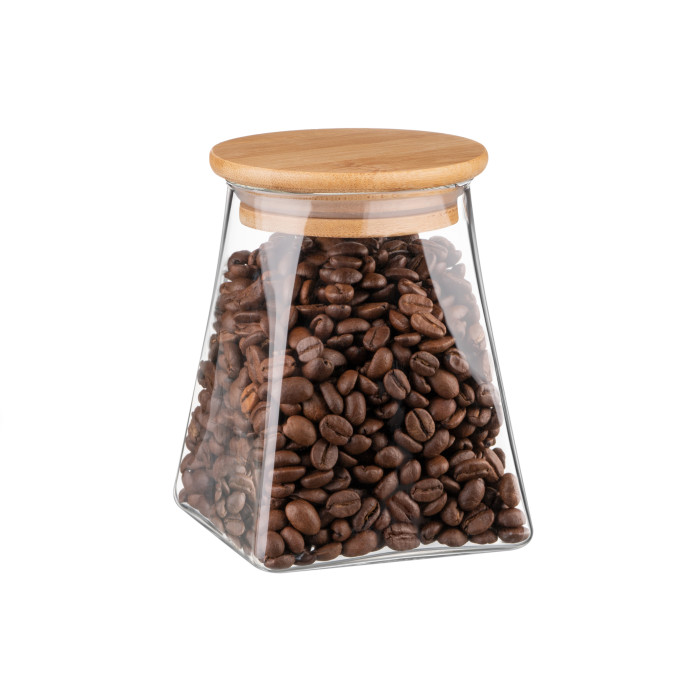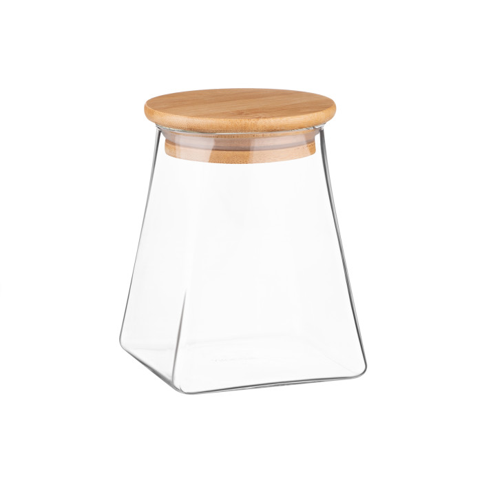 Прозора банка для зберігання з боросилікатного скла має конусну форму й об’єм 510 мл. Оснащена щільною бамбуковою кришкою. Висота – 12 см. Можна мити в посудомийній машині.