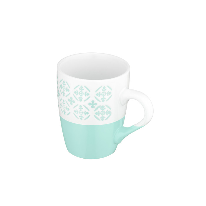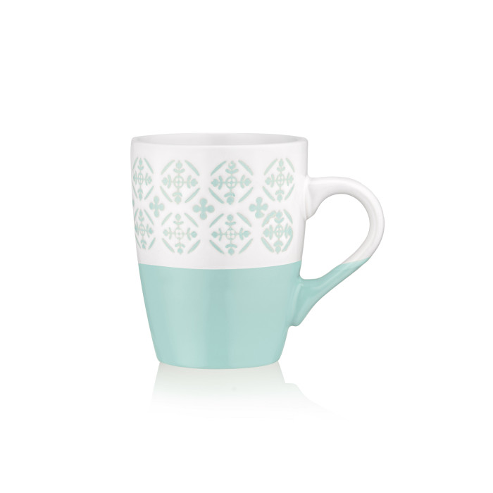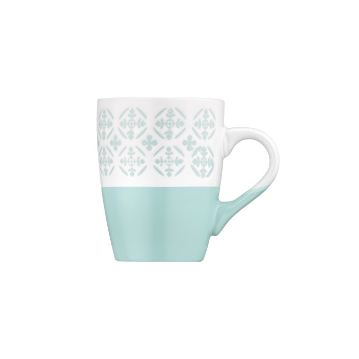 Яскраву та стильну чашку серії Ornament виготовлено з якісної кераміки. Її об’єм становить 320 мл, основні кольори – блакитний і білий, дизайн гармонійно доповнено геометричним візерунком. За висоти 10,5 см верхній діаметр складає 8,3 см. Згодиться для щоденного використання, адже придатна до миття в посудомийній машині та використання в мікрохвильовій печі.