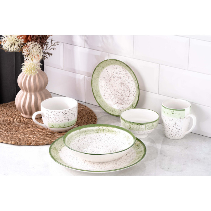 Чашка серії Siena – це елегантний і практичний елемент сервірування, який надасть столу вишуканості та стилю. Виріб виготовлено з порцеляни – міцного та стійкого до подряпин і сколів матеріалу, який забезпечує тривале використання. Завдяки діаметру об’єму 500 мл у чашці можна подавати різноманітні напої. Основні кольори – білий і зелений, тож пасуватиме чи не до будь-якого дизайну кухні.