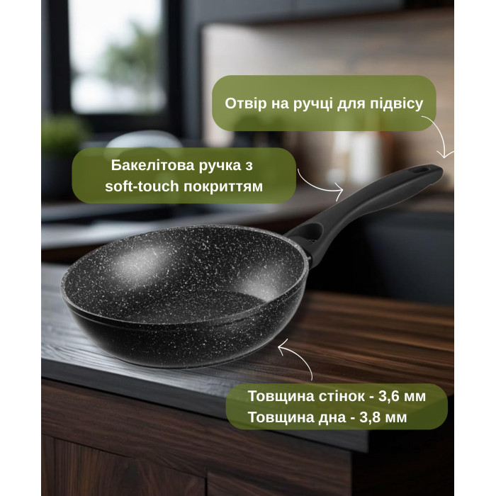 Алюмінієва глибока сковорода серії Gemini Gourmet Anzio чорного кольору з мармуровим антипригарним покриттям та термостійкою бакелітовою ручкою з Soft-touch покриттям. Сковорода сумісна з усіма видами плит, включаючи індукційну.
