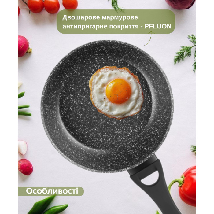 Алюмінієва глибока сковорода серії Gemini Gourmet Anzio чорного кольору з мармуровим антипригарним покриттям та термостійкою бакелітовою ручкою з Soft-touch покриттям. Сковорода сумісна з усіма видами плит, включаючи індукційну.