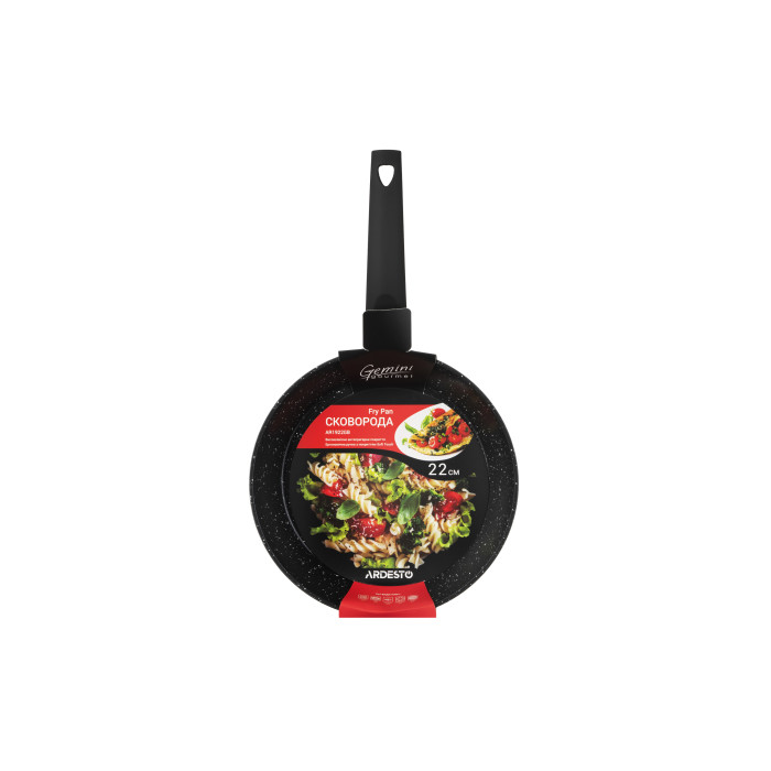 Алюмінієва сковорода чорного кольору з антипригарним покриттям та термостійкою бакелітовою ручкою. Сковорода Gemini Gourmet AR1922GB сумісна з усіма видами плит – газовими, електричними, галогенними, склокерамічними та індукційними.