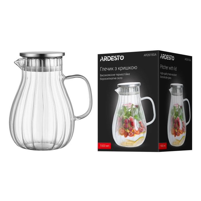 ARDESTO Глечик з кришкою Iceberg, 1500мл, боросилікатне скло, нержавіюча сталь, прозорий