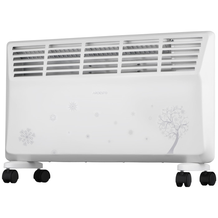 Електричний конвектор з механічним керуванням білого кольору зі стильним візерунком, класом захисту IP20 і двома режимами потужності 1 000/2 000 Вт. Розрахований на обігрів приміщень площею до 20 м2. Клас енергозахисту – перший. У цій моделі передбачено сушку та контейнер для природного зволоження повітря. Є захист від перегріву та датчик від перекидання. Ця модель обігрівача має два типи монтажу – настінний і підлоговий. Кронштейни та опори із коліщатками для підлогового встановлення постачають у комплекті з обігрівачем.