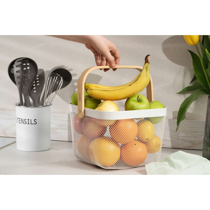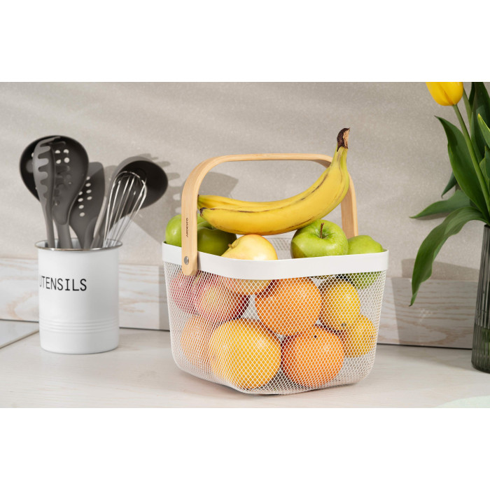 Фруктовниця ARDESTO Midori виготовлена в сучасному дизайні у вигляді металевого кошика білого кольору з дерев’яною ручкою. Виріб функціональний і місткий (25 × 24,5 × 18 см). Фруктовницю легко чистити вручну. Це не просто практичний предмет посуду, а й стильний елемент декору, який доповнить інтер’єр кухні.