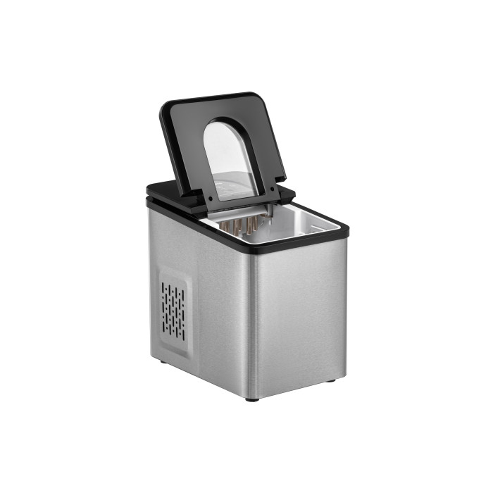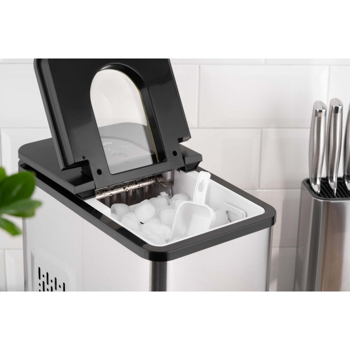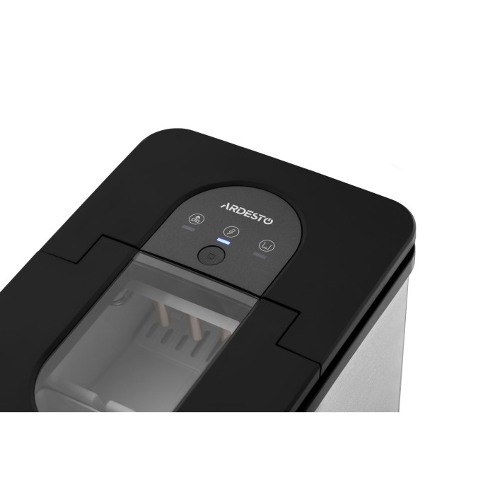Портативний побутовий льодогенератор для швидкого приготування харчового льоду. Пристрій виконаний у стильному і практичному корпусі із нержавіючої сталі, оснащений сенсорною панеллю керування, індикаторами роботи та віконцем для візуального контролю кількості льоду. Клас захисту – І. Максимальна продуктивність ARDESTO IM-A1200SS – 12 кг льоду на добу. Контейнер для льоду – 0,6 кг, цикл приготування льоду триває близько 9 хв. Об’єм резервуара – 1,8 л.