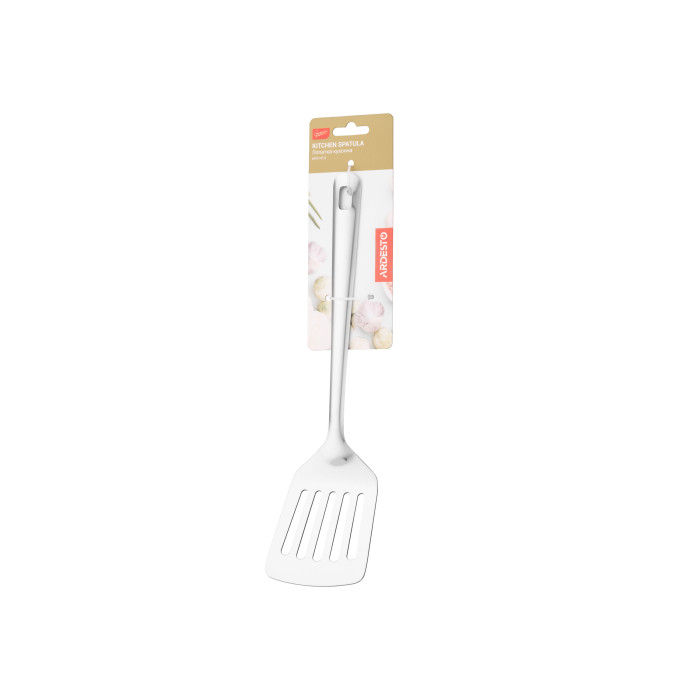 Лопатка ARDESTO Gemini виготовлена з нержавіючої сталі. Міцне руків’я з зручно лягає в руку та має отвір для підвішування. Виріб можна мити в посудомийній машині.