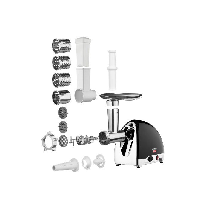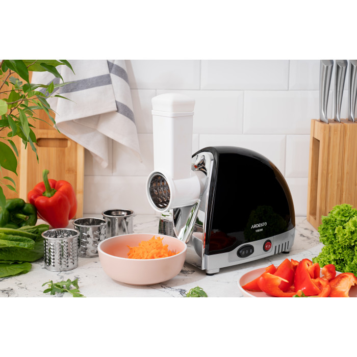 М’ясорубка з потужністю 1800 Вт, змінними насадками для приготування фаршу, домашніх ковбасок та кеббе, а також насадкою для терки та шинкування.