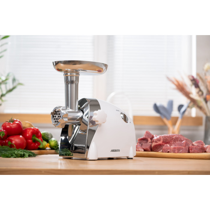 ARDESTO М'ясорубка, 2000Вт, продук.-1.9кг/хв, 3 решітки + для ковб., кеббе, 3 терки, пластик, біло-сріблястий