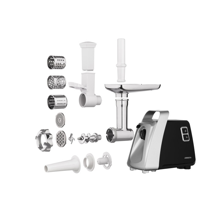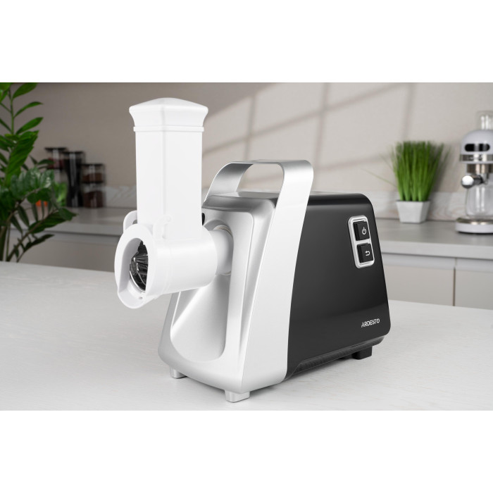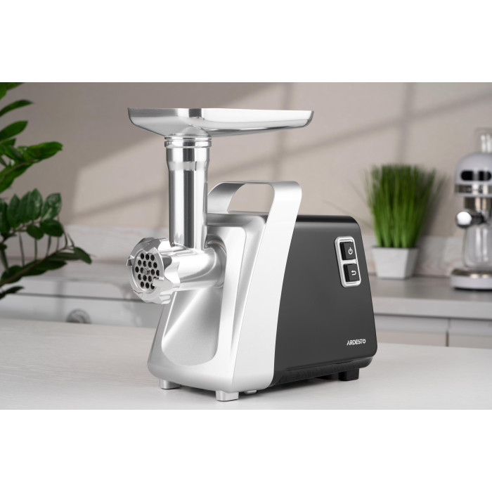 М'ясорубка Ardesto, 2100Вт, 2кг/хв, 3 решітки, насадка для ковбас, кеббе, томатів, 3 терки, бургер-прес, пластик, чорно-срібний