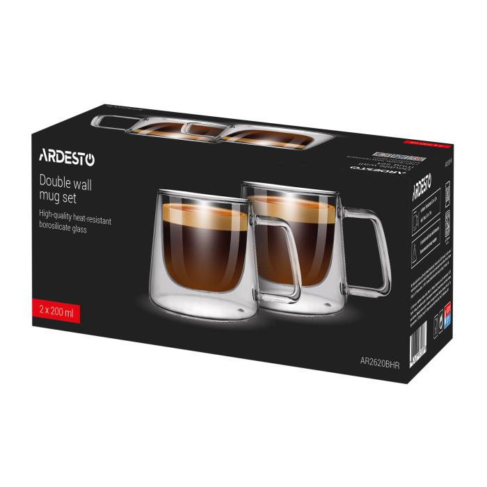 Набір чашок з ручками і подвійними стінками Ardesto, 200мл, 2шт, боросилікатне скло, прозорий