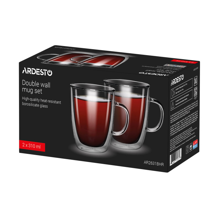 ARDESTO Набір чашок з ручками і подвійними стінками, 310мл, 2шт, боросилікатне скло, прозорий