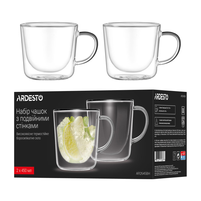 Набір чашок з ручками і подвійними стінками Ardesto, 450мл, 2шт, боросилікатне скло, прозорий (AR2645BH)