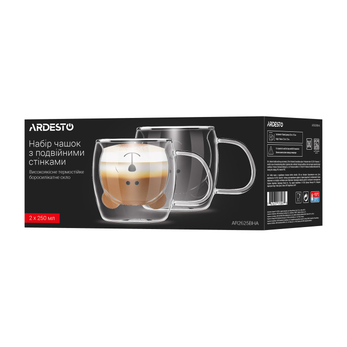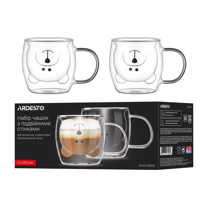 ARDESTO Набір чашок з ручками і подвійними стінками Animals, 250мл, 2шт, боросилікатне скло, прозорий