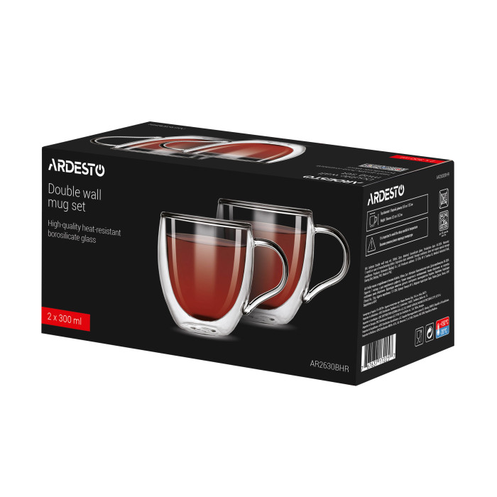 ARDESTO Набір чашок із ручками з подвійними стінками, 300 мл, H 9,2 см, 2 шт, боросилікатне скло