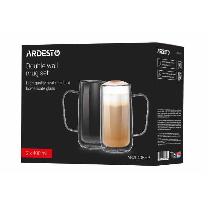 Чашки ARDESTO із подвійними стінками з якісного боросилікатного скла вирізняються термостійкістю (від -20 до +150 °C) і підтримують температуру напоїв – і холодних, і гарячих – упродовж тривалого часу. Об’єм 400 мл є оптимальним для подавання як улюбленого лате, так і ароматного чаю. Верхній діаметр становить 7,5 см за висоти 16 см. Важливо пам’ятати, що миття чашки в посудомийній машині не рекомендовано.
