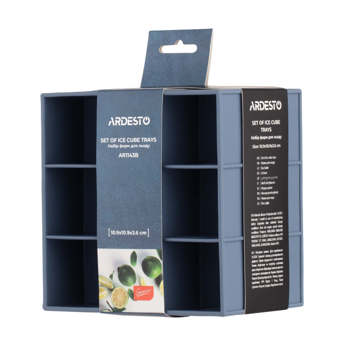 Форма для льоду – практичний і стильний аксесуар на будь-якій кухні. Набір ARDESTO Gemini складається з двох форм розміром 10,9 × 10,9 × 3,6 см, виготовлених із якісного силікону. Завдяки приємному синьому кольору вироби мають сучасний вигляд. Силіконові вставки забезпечують легке діставання льоду, роблячи використання максимально зручним. Форми можна мити в посудомийній машині, що спрощує догляд за ними. Це вдале рішення для приготування кубиків льоду для напоїв і кулінарних експериментів (фруктові чи ягідні кубики, льодові десерти, кубики для бульйону, кавові кубики) чи використання в косметичних цілях.