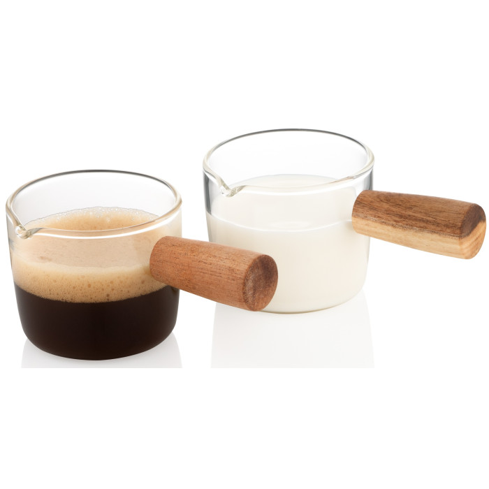 У наборі дві ємності об’ємом 100 мл, які можна використовувати для подавання соусів, молока або вершків. Щодо особливостей конструкції: за висоти 5,2 см верхній діаметр горлечок становить 6 см, також обидва вироби мають акуратний зливний носик. Ємності виготовлено з боросилікатного скла, саме цим зумовлений широкий діапазон термостійкості – від -20 до +150 °C. До того ж і проблем із доглядом не виникне, адже вироби допустимо мити посудомийній машині, не рекомендовано використовувати в мікрохвильовій печі.