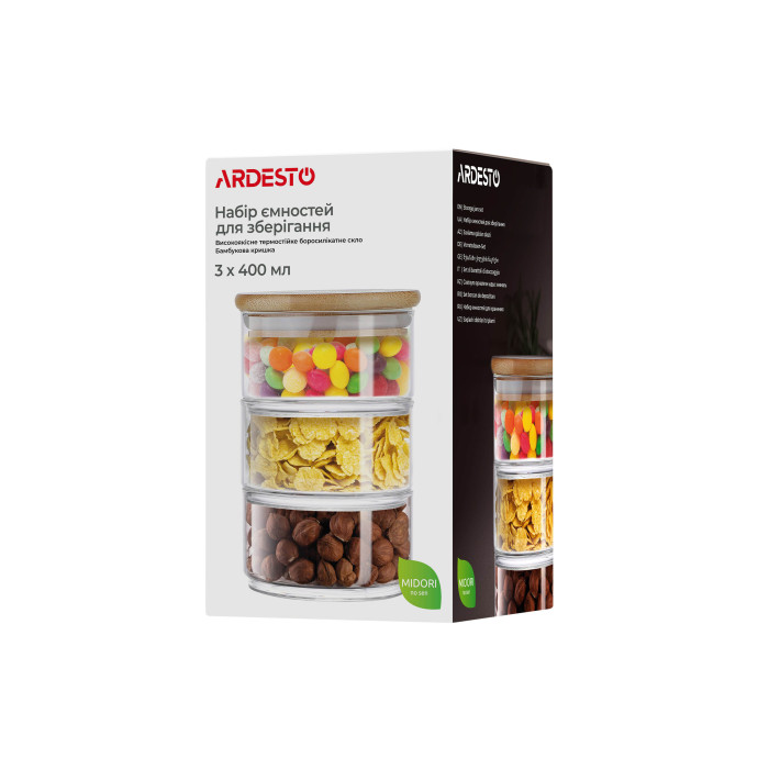 Набір для зберігання ARDESTO Midori складається із трьох прозорих ємностей об’ємом по 400 мл, що вироблені з боросилікатного скла, і бамбукової кришки. Вони надають змогу зекономити простір, якщо поставити їх одна на одну. Ємності діаметром 11 см за висоти 19 см є вдалим рішенням для компактного зберігання продуктів. Крім того, вони термостійкі (від -20 до +150 °C) і придатні до миття в посудомийній машині.