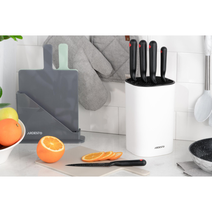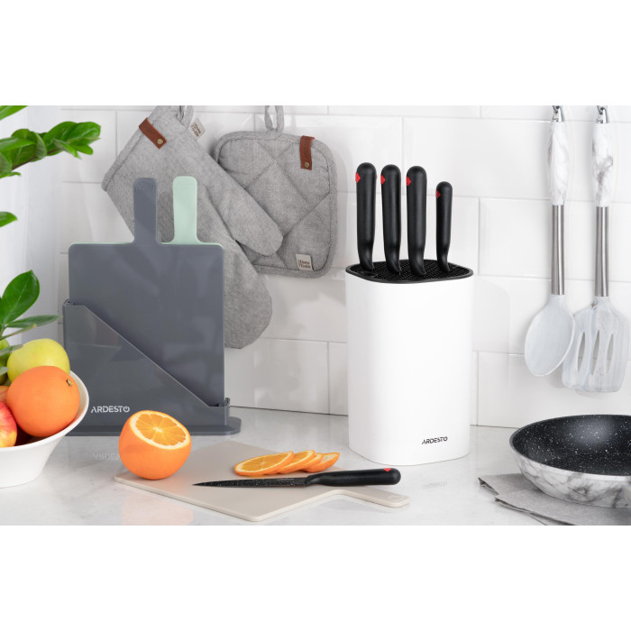 Кухня – місце, де створюють кулінарні шедеври й без якісного інструментарію тут не обійтися. Набір ножів ARDESTO Black Mars із п’яти предметів – це вдале комплексне рішення, де наявні: кухарський ніж (20,3 см), універсальний ніж (12,7 см), ніж для хліба (20,3 см), ніж слайсерний (20,3 см) і ніж для чищення овочів (8,9 см).
