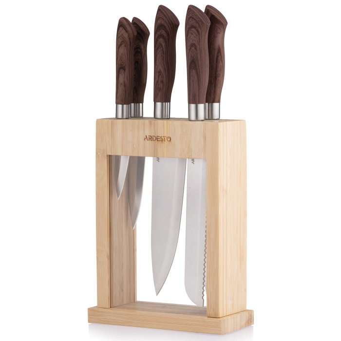 Набір ножів з блоком ARDESTO Midori, 6 предметів, нержавіюча сталь, пластик, бамбук, коричневий
