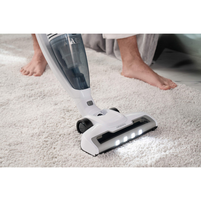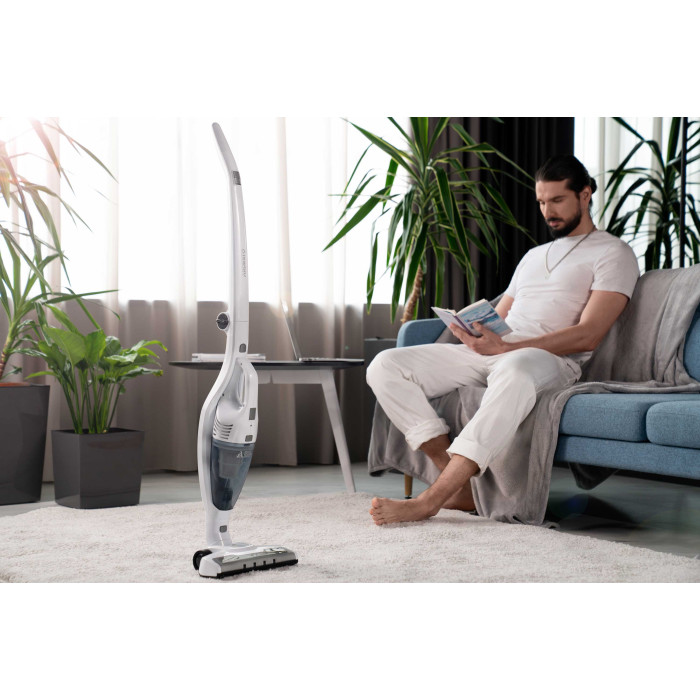 Бездротовий акумуляторний пилосос із потужністю всмоктування 29 Вт допоможе ефективно прибрати приміщення, адже оснащений HEPA-фільтром, що затримує дрібнодисперсні часточки та пил. Неспростовною перевагою, зокрема для людей, які страждають від алергії на домашній пил, є те, що під час збирання сміття, пилосос ще й очищує повітря. У комплекті постачання є кріплення для вертикального встановлення на стіну та дві насадки: для прибирання важкодоступних місць та турбощітка. Неспростовною перевагою за умов перебоїв в електропостачанні є можливість автономної роботи: у турборежимі – 17 хв., у звичайному – 35 хв. Крім того, конструкцією передбачено знімний ручний модуль для швидкого прибирання.