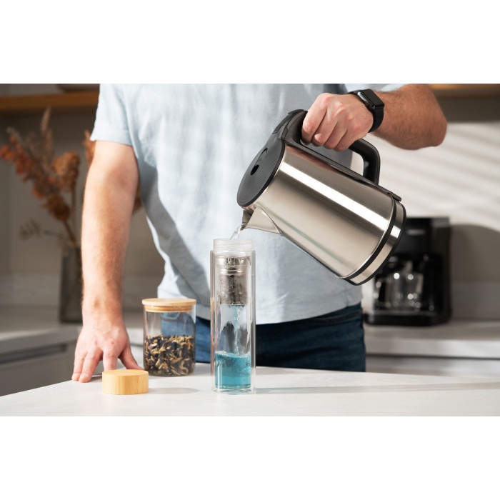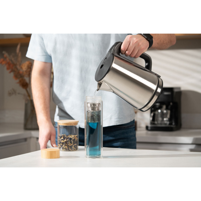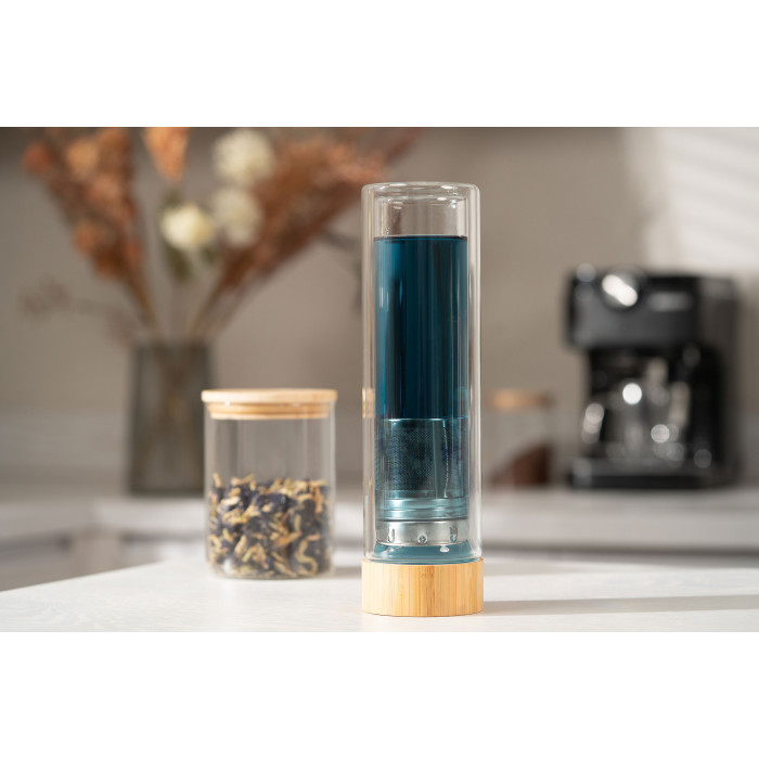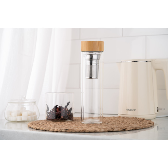 Вироблений із боросилікатного скла, термос із подвійними стінками ARDESTO об’ємом 450 мл підтримує оптимальну температуру улюбленого напою – як холодного, так і гарячого – упродовж 2 год. Ситечко з нержавіючої сталі забезпечує можливість легко заварювати чай прямо в термосі, а бамбукова кришка додає ноток природної елегантності. Діапазон термостійкості – від -20 до +150 °C, до того ж термос придатний до миття в посудомийній машині.