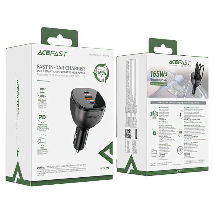 Автомобільний зарядний пристрій ACEFAST B14 оснащений двома портами USB-C та одним портом USB-A і забезпечує швидку зарядку з підтримкою різних протоколів, включаючи PPS, PD2.0, PD3.0, PD3.1, QC2.0, QC3.0, QC4+, FCP, AFC та SCP. Виготовлений із міцного цинкового сплаву та полікарбонату, ACEFAST B14 забезпечує надійність та безпеку завдяки вбудованому захисту від перевантаження, перенапруги та перегріву. Якісні контакти та вбудований смарт-чіп PD3.1 забезпечують надійне з’єднання та гарантують ефективну, стабільну та безпечну зарядку ваших девайсів.