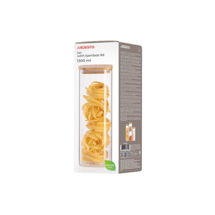 Квадратну банку для зберігання ARDESTO серії Midori об’ємом 1 300 мл виготовлено з екологічного боросилікатного скла, яке не вбирає запахи, зберігаючи аромат і смак продуктів, та гарантує довговічність виробу. Бамбукова кришка забезпечує герметичне паковання. Виріб можна мити в посудомийній машині (крім бамбукової кришки).