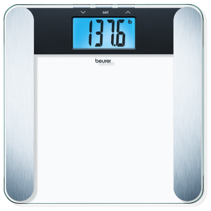 Велика опорна поверхня зі скла товщиною 8 мм. Дуже великий дисплей з синім підсвічуванням. Вага, жирова і кісткова маса, частка вологи і м'язової тканини. Електроди з полірованої нержавіючої сталі. П'ять рівнів активності. Технологія включення Quick Start. Автоматичне вимикання, індикація перевантаження. Максимальна вага 180 кг. Розмір цифр 40 мм.