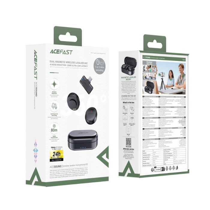 ACEFAST R3 — це бездротова мікрофонна система, створена для тих, хто записує відео, подкасти, сториз або проводить онлайн-етери й хоче отримати чіткий, природний голос без сторонніх шумів. Завдяки всеспрямованому 360° захопленню мікрофон фіксує голос рівномірно та точно, не гублячи деталей, навіть якщо ви рухаєтесь. Інтелектуальний DEEP AI-шумозаглушувач ефективно відсікає фонові звуки — вітер, шум вулиці чи приміщення. У результаті запис звучить чисто й професійно без потреби в додатковій обробці.