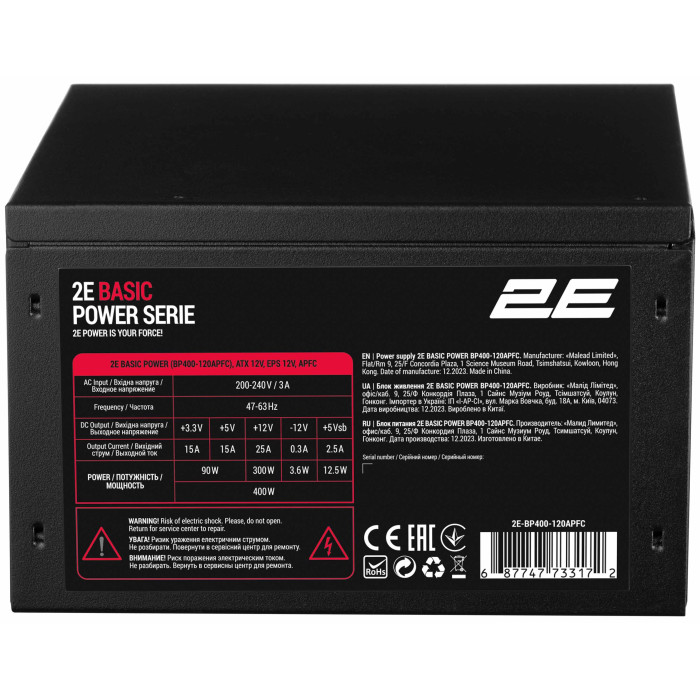 Блок живлення 2E Basic Power (400W) з кабелем живлення для сучасних персональних комп'ютерних систем бюджетного рівня, офісних ПК для вирішення нескладних завдань.