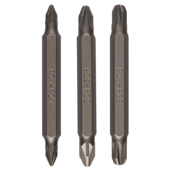 Набір з трьох двосторонніх біт довжиною по 60 мм — PZ1-PZ1, PZ2-PZ2, PZ3-PZ3. Виготовлені з високоякісної сталі, насадки з шестигранним хвостовиком 1/4 дюйма.