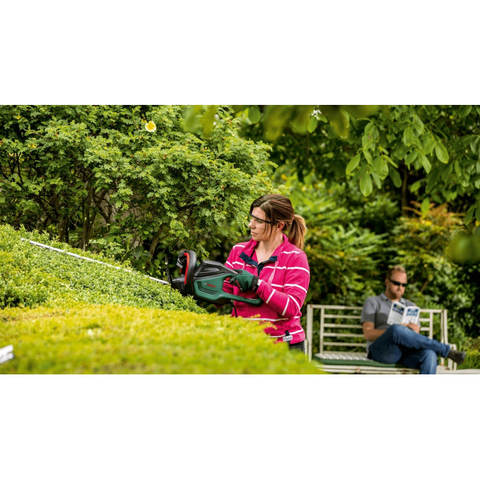 Кущоріз AdvancedHedgeCut 70 ідеально підходить для легкої та безшумної стрижки великих кущів. Потужні двигун потужністю 500 Вт у звукоізоляційному корпусі ProSilence, який обмежує рівень шуму до 93 дБ, є енергоефективним і на 80% тихішим, ніж наші провідні мотоножиці для живої огорожі. Високомоментна фрикційна муфта дозволяє легко обрізати товсті гілки, не пошкоджуючи двигун. Його леза довжиною 70 см, відшліфовані за допомогою лазера та з алмазним напиленням, дозволяють без зусиль обрізати гілки діаметром до 34 мм, працюючи швидко та ефективно. Цей кущоріз ідеально підходить для стрижки хвойних, лаврових, тисових, букових, падубових, грабових, кипарисових і калинових кущів, а також кущів з кипарисовика Лейланда.