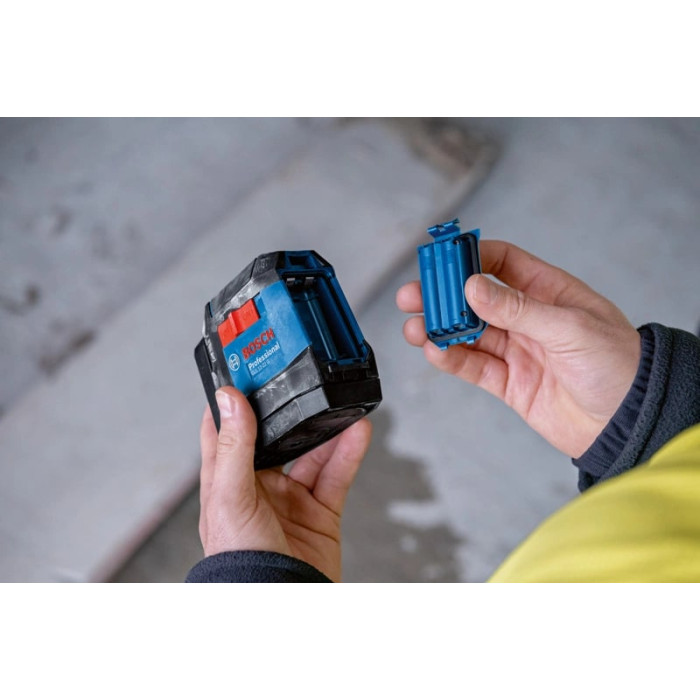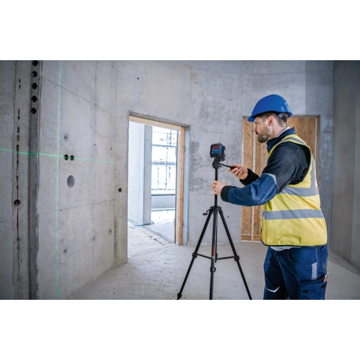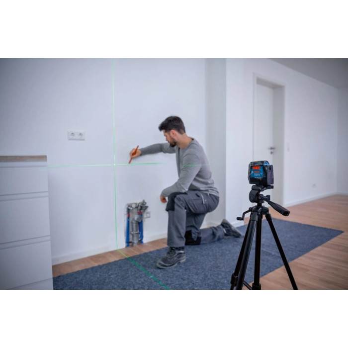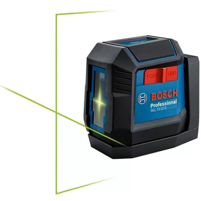 GLL 12-22 G — міцний лінійний лазер з добре видимими зеленими лазерними лініями для швидкого і точного вирівнювання на будівельних майданчиках. Цей компактний інструмент призначений для роботи у важких умовах. Він захищений від пилу та водяних струменів гумовим армованим корпусом зі ступенем захисту IP55. Вбудоване поворотне кріплення з потужними магнітами забезпечує стабільне закріплення і захищає об'єктив лазера під час зберігання або транспортування.