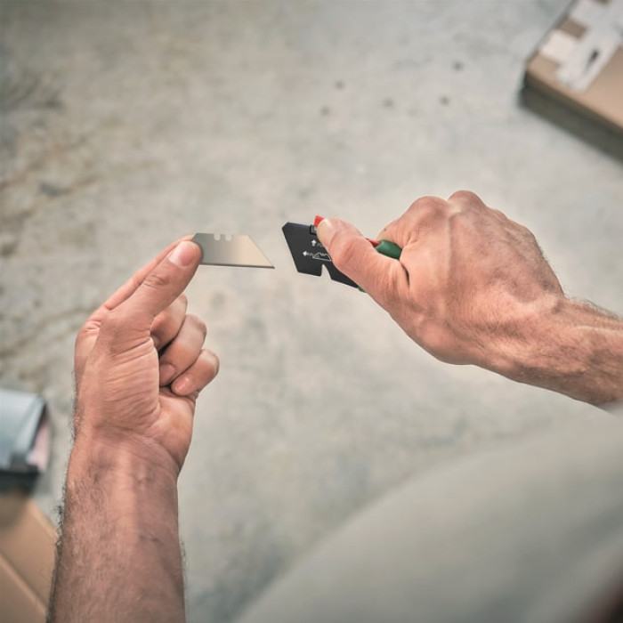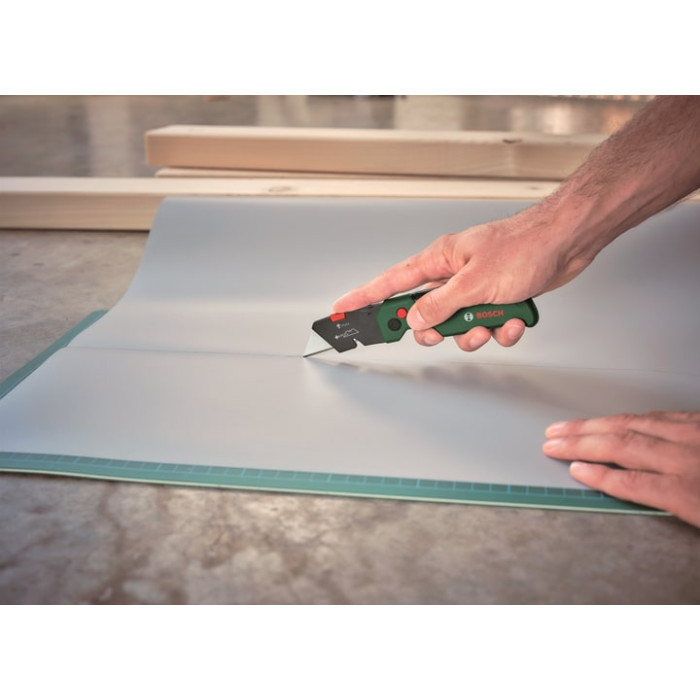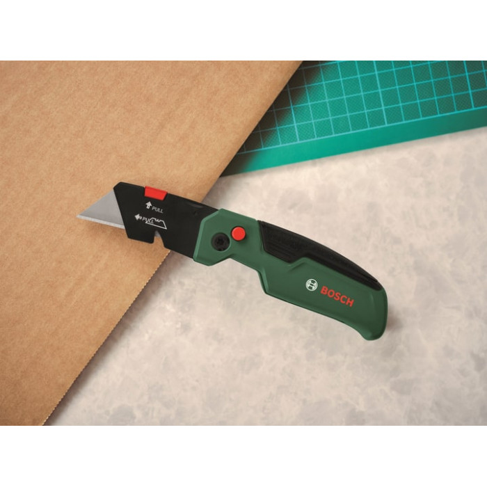 Складаний ніж від Bosch має довговічну конструкцію та пропонує майстрам, які займаються домашнім ремонтом, широкий спектр можливостей для різання. Для зручності використання та контролю ніж має міцний корпус із м'якою ручкою, ергономічну виїмку для пальців і затискач для носіння на поясі. Безпека та зручність використання ножа максимально підвищена: механізм плавного складання леза дозволяє відкривати його однією рукою, кнопка з витяжним механізмом полегшує заміну леза, а кілька стандартних запасних лез SK5 зберігаються в тильній частині ножа.