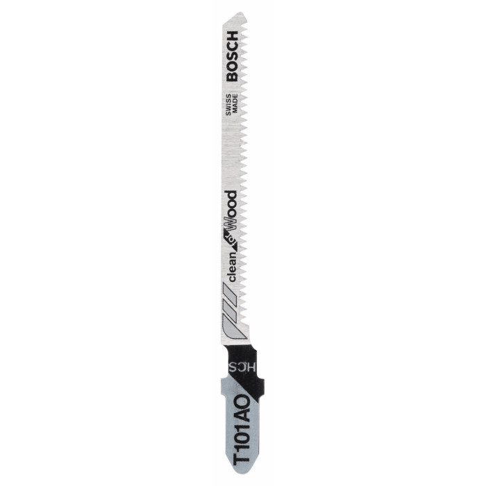 Пилка Bosch T 101 AO довжиною 82 мм, з поверхнею з зубцями 59 мм, з кроком зубців 1,4 мм, 19 TPI. Із високовуглецевої HSC сталі. Виконує чисте, криволінійне різання м'якої деревини та ДСП товщиною 1,5-15 мм. В упаковці 2 шт.