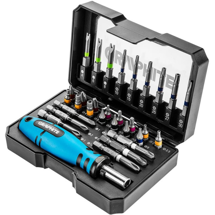 GRAPHITE 56H602 - це набір біт із сервісними шліцами, які застосовуються в ремонті смартфонів, фотоапаратів, комп'ютерної та дрібної побутової техніки. У набір входить 30 біт і викрутка-бітотримач. Набір виконаний на високому рівні, що дає змогу використовувати його на професійному рівні.