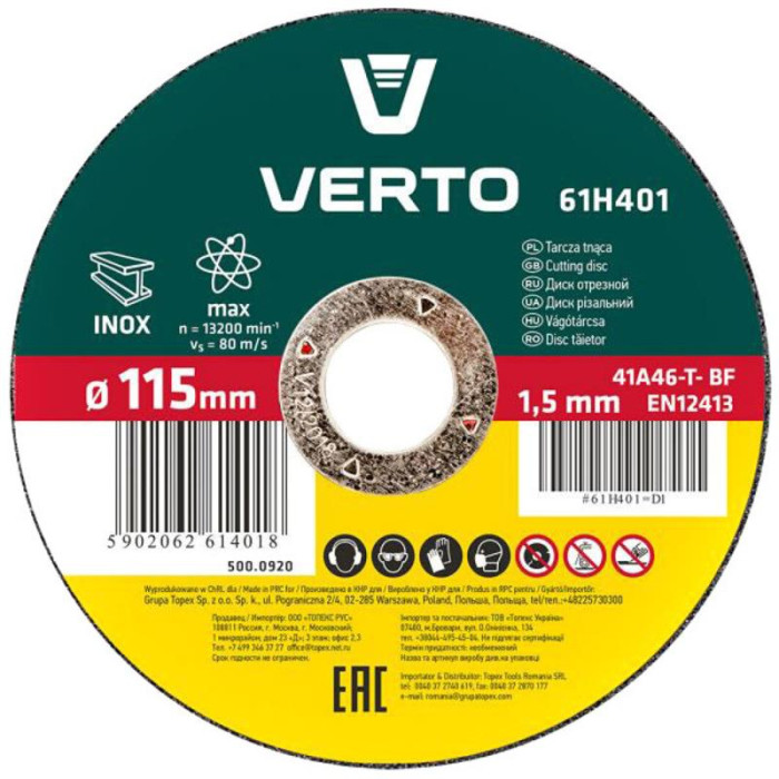 Диск відрізний по металу VERTO. Завдяки зменшеній товщині дозволяє значно скоротити час роботи. Забезпечує високий рівень безпеки праці завдяки відповідності виробу вимогам стандарту EN 12413. Бренд VERTO пропонує асортимент електроінструменту та робочого приладдя для кожного домашнього майстра.
