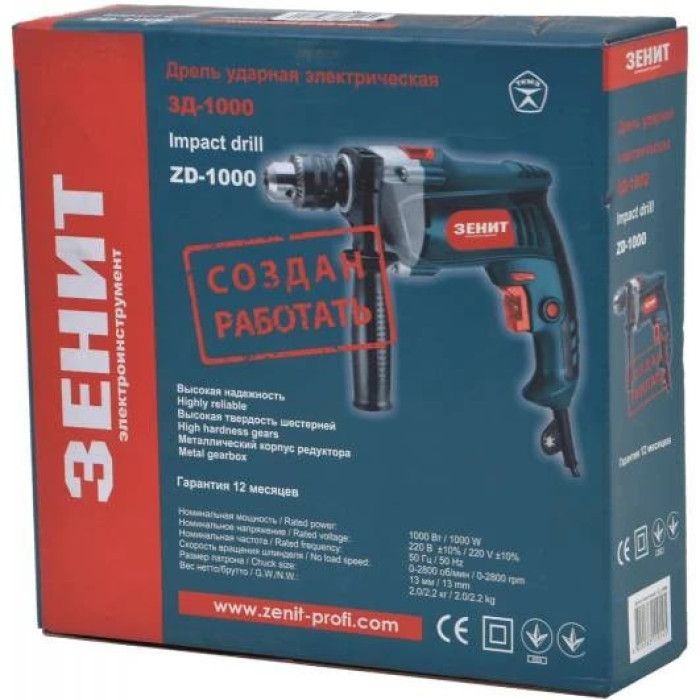 Дриль ударний Зеніт ЗД-1000 1000Вт зубчастий патрон 13мм 0-2800об/хв 1.9кг