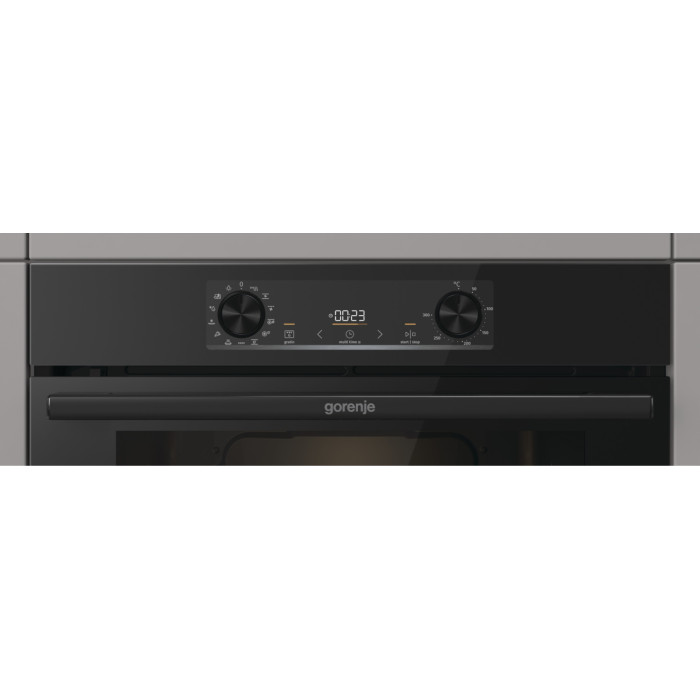 Gorenje BOP6373E28EBG — стильна вбудована електрична духовка об’ємом 77 л з енергетичним класом A+, оснащена піролітичним самоочищенням, IconLed-дисплеєм, функціями AirFry, FrozenBake та можливістю готувати на різних рівнях. Колір — чорний.