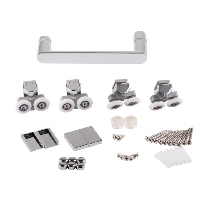 Глухе скло, скляні двері, розширювальні профілі, верхній профіль, нижній профіль, ручка, подвійні ролики, комплект кріплень, набір ущільнювачів, заглушки.