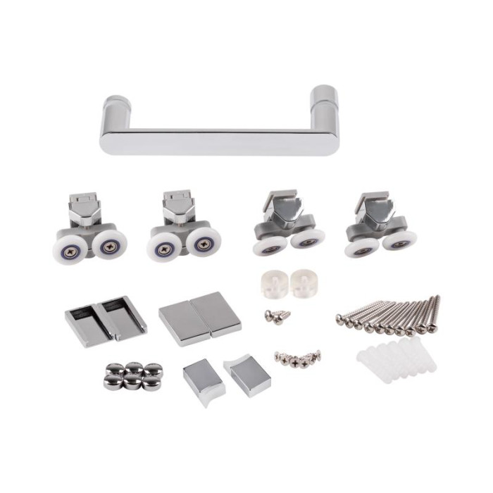 Глухе скло, скляні двері, розширювальні профілі, верхній профіль, нижній профіль, ручка, подвійні ролики, комплект кріплень, набір ущільнювачів, заглушки.